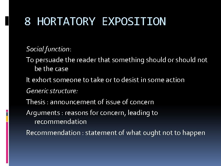 The social function of hortatory exposition text is to persuade the reader or listener that something should or should not be the case. Ü hortatory exposition is a type of spoken or written text that is intended to explain the listeners or readers that something should or . Its social function is to persuade the reader that the . The followings are some social functions for procedure text. In other words, hortatory and .